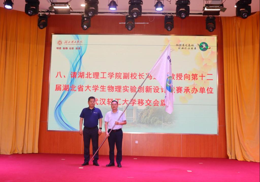 余宏生宣布第十二届湖北省大学生物理实验创新设计大赛承办单位为武汉轻工大学。冯运仿教授与武汉轻工大学副校长曾山教授上台,进行会旗交接仪式。