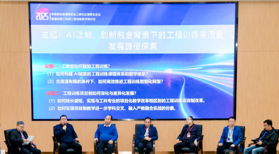 主题报告之后,湖南大学蔡立军教授主持圆桌论坛,与刘新教授、杨建新教授、何高法教授、王才东教授等6位专家学者,围绕“AI 赋能的工程训练课程和教学体系建设”“学科交叉、产教融合的项目制教学”等问题,分享工作思考和实践经验,碰撞思想火花。